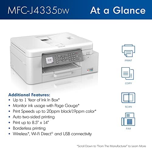 Brother MFC-J4335DW INKvestment Tank Wireless All-in-One Color Inkjet Printer, Up to 1-Year of Ink in-Box, Duplex Printing, Mobile and Cloud Print, Works with Alexa