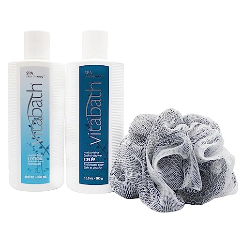 Vitabath Spa Skin Therapy Everyday Skincare Set Moisturizing Shower Gel Wash, Reviving Lotion & Exfoliating Body Scrubber Pouf - Refreshing Foam Cleanser & Dry Skin Hydration for Women & M
