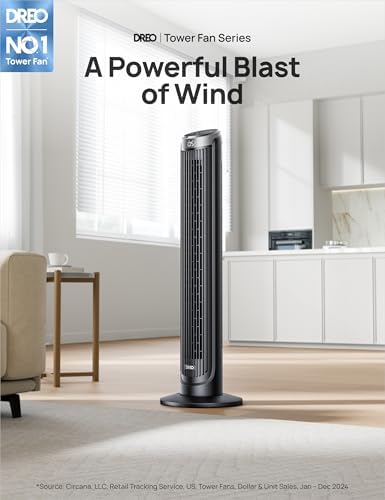 Dreo Tower Fan for Bedroom, 90° Oscillating Fans that Blow Cold Air, 5 Speeds, 4 Modes with 26ft\/s Velocity, 12H & 28dB Quiet Timer, Remote, Touch, 40" Standing Floor Fan for Home Office, Bla