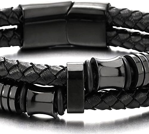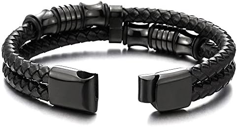 COOLSTEELANDBEYOND Mens Double-Row Braided Leather Bracelet Bangle Wristband with Stainless Steel Ornaments