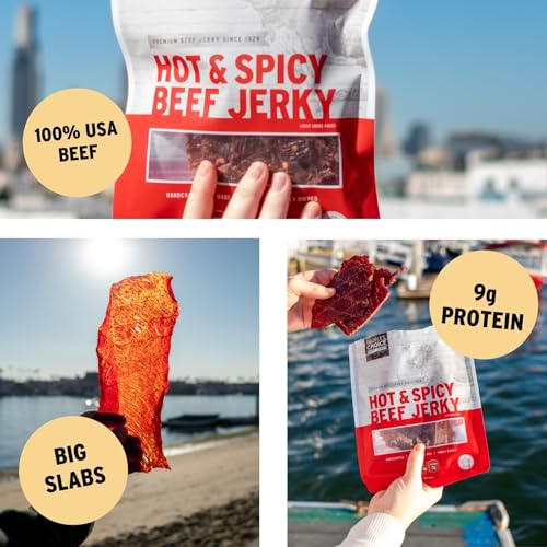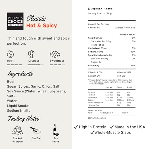 People\u2019s Choice Beef Jerky \u2013 Hot & Spicy Big Slab \u2013 Whole Muscle, Thin-Sliced, Slab Jerky Texture \u2013 9g Protein per Serving \u2013 Made in USA \u2013 15 Count, 19.2 oz Bag
