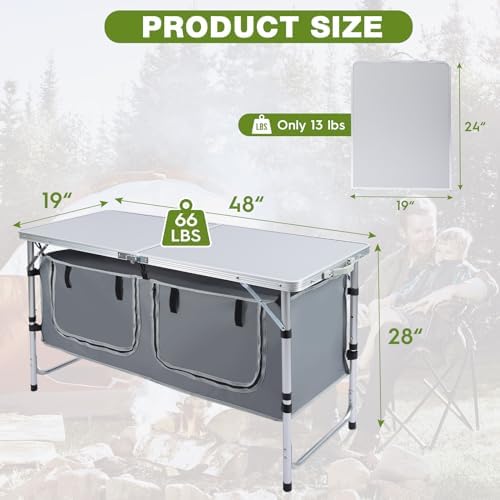 Pnbfhn Outdoor Folding Camping Table with Storage Organizer, Portable Aluminum Composite Panel Lightweight Table, 3 Adjustable Height, for Indoor, BBQ, Party, Picnic, Hiking, Beach