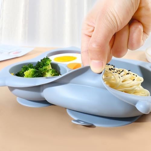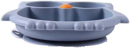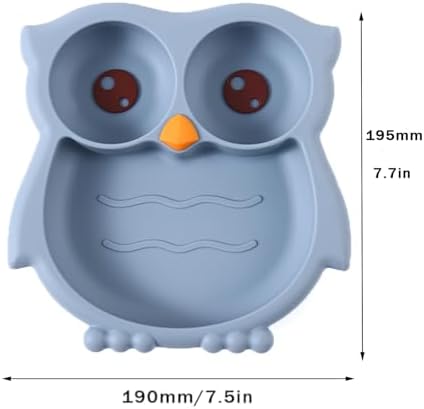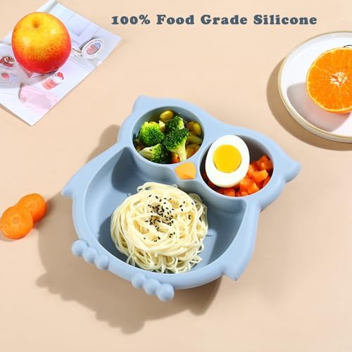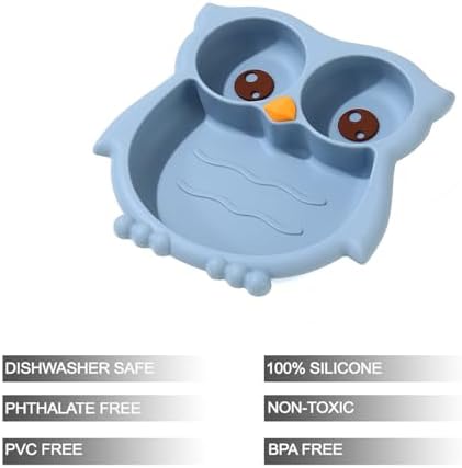 PandaEar Toddler Suction Plates, Stay Put Divided Baby Plates, Owl Shape BPA-Free 100% Food-Grade Silicone Unbreakable Baby Plate, Baby Feeding Supplies (Blue)