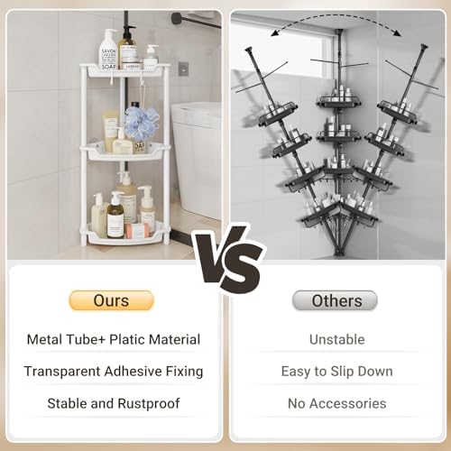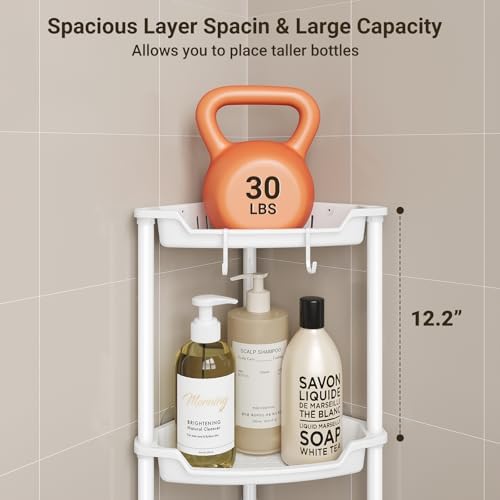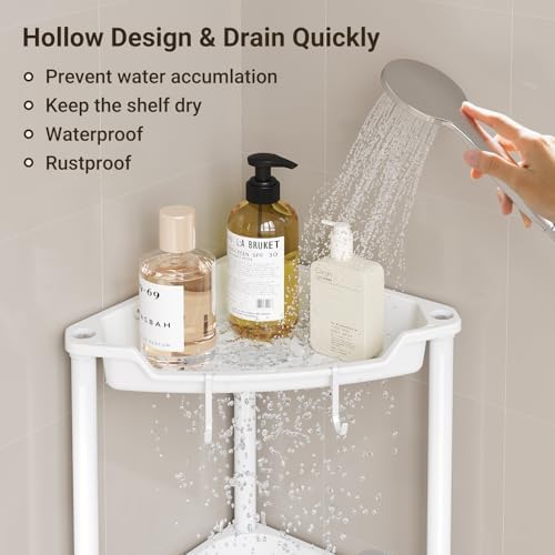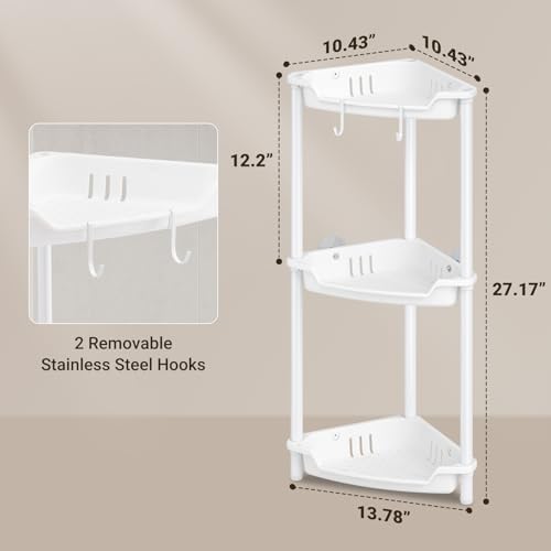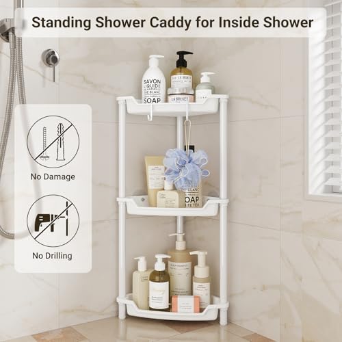 ELYKEN Corner Shower Caddy, 3 Tier Rustproof Floor Standing Shower Organizer, Plastic Metal Splicing Floor Shower Corner Shelf Rack Storage Stands Adjustable Feet & 2 Hooks for Bathroom, White