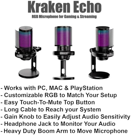 Kraken Echo RGB USB Condenser Microphone for Gaming, Podcast & Streaming for PC, PS5, PS4, MAC, Laptops. Touch Mute - Gain Knob - Monitoring - Controllable RGB - PC Gaming Mic with Desk Stand (Bla
