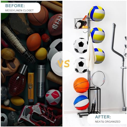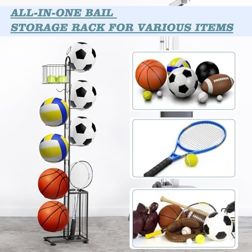 melos 7 Tier Basketball Ball Storage Rack, Freestanding Basketball Holder Garage Ball Storage Sport Organizer Rack with Basket for Volleyball Football Basketball, Indoor\/Outdoor