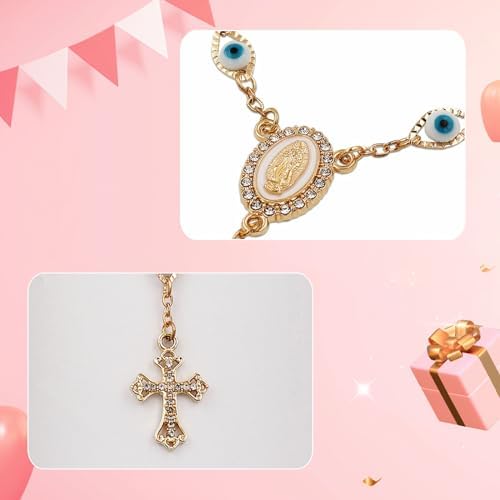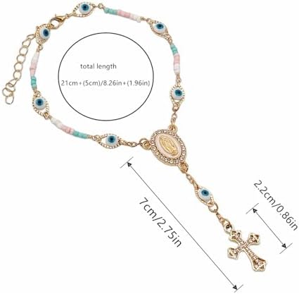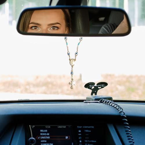 LCWLJL Car Rosary for Rearview Mirror,Evil Eye Rearview Mirror Auto Rosary Beads Car Medal and Cross Hanging Accessories for Mirror Interior Decors for Women Men