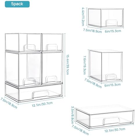 Vtopmart Stackable Storage Drawers Set of 5, Clear Plastic Organizer Bins for Beauty Supplies,Ideal for Vanity, Bathroom,Cabinet,Pantry Organization