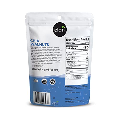 Elan Organic Chia Walnuts, 4.5 oz, Non-GMO, Gluten-Free, Vegan, Kosher, Healthy Snacks, Glazed Nuts with Chia Seeds, Goji Berry Powder & Himalayan Pink Salt, Superfood Infused Nuts