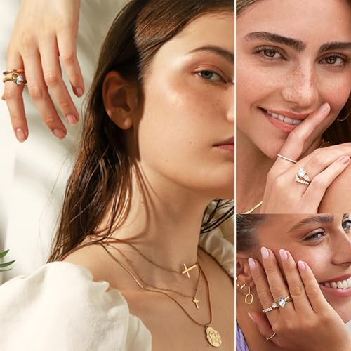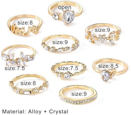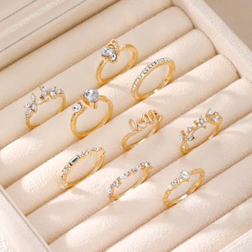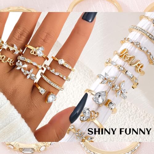 17IF Gold Boho Sparkle Knuckle Rings Set For Women, Vintage Fashion Aesthetic Trendy Joint Snake Ring Pack, Retro Pink Rhinestone Assorted Moon Star Crystal Love Leaf Diamond Pearl Jewelry