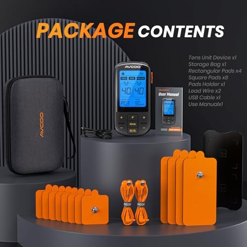 AVCOO 3-in-1 TENS Unit with 32 Modes, Dual Channel EMS Muscle Stimulator with 40 Intensities for Gradual Pain Relief Therapy, Rechargeable Electronic Pulse Massager with 12 Electrode Pads, EVA Case