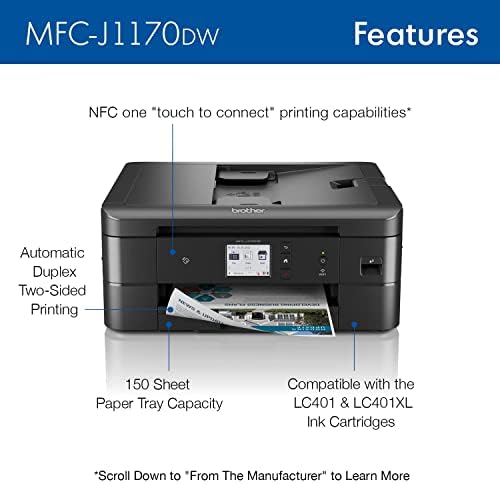 Brother MFC-J1170DW Wireless Color Inkjet All-in-One Printer, NFC One-Touch Print, Duplex, Cloud Print & Scan, Mobile App Control, 2.7" Touchscreen, Works with Alexa