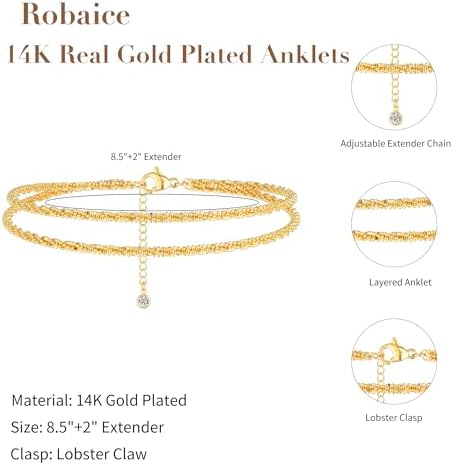 Robaice Ankle Bracelets for Women, Glitter Waterproof Adjustable Anklet for Women, 14K Gold Plated\/Sterling Silver Layered Anklets, Summer Beach Anklet Jewelry for Women Gift