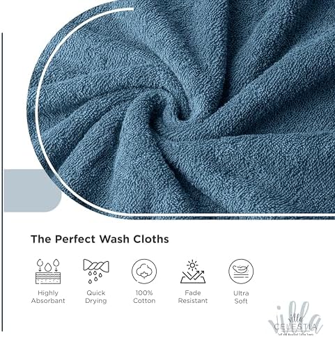 Villa Celestia 100% Cotton Wash Cloth for face & Body Set of 6, (12 x 12 inches) Sustainable, Soft, Highly Absorbent, Combed Cotton Wash Cloths Pack of 6 for Hotels, Spa, Bathroom, Dorm, Blue