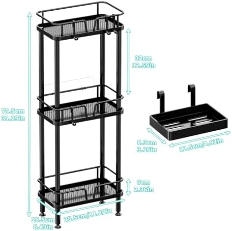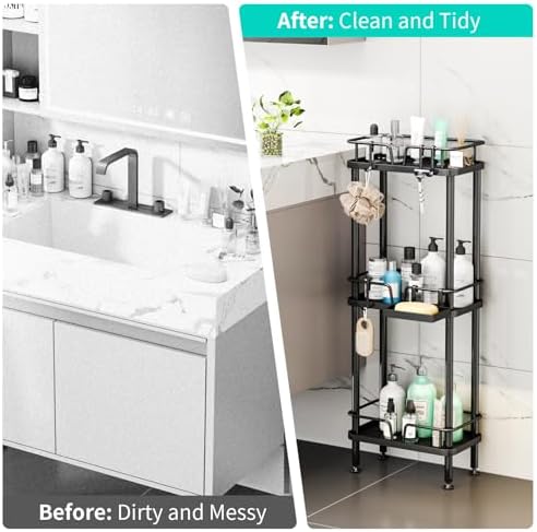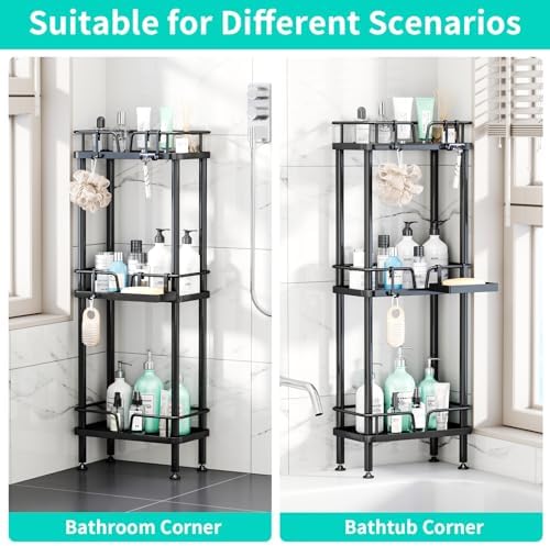 HapiRm Standing Corner Shower Caddy - 3 Tier Corner Shower Organizer with Soap Holder, Rustproof Stainless Steel Bathroom Shelf with 4 Hooks, Black