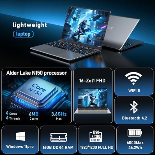 MITUNTUN 2025 16 Inch Gaming Laptop, N150 (Up to 3.6GHz), 16GB RAM 1TB SSD, Integrated Graphics (1GHz), 1920 * 1200 Display, 6000mAh Battery, Win 11 Pro Lap Top, WiFi 5 \/BT4.2, Backlit Keyboard