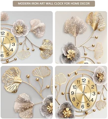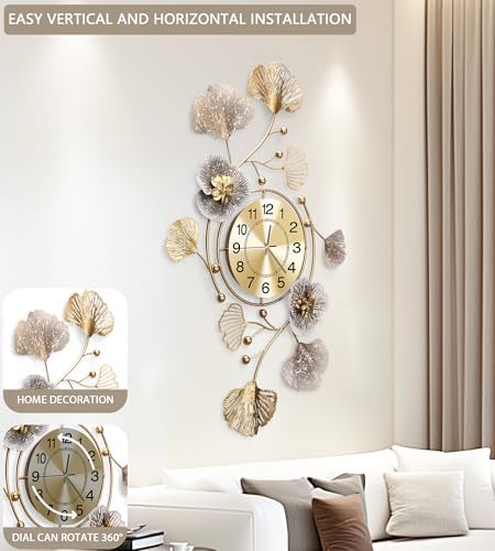 JXQXYN Clocks for Living Room, Large Wall Clock, 3D Silent Wall Clock, Retro Metal Ginkgo Leaf Design, for Bedroom Kitchen Decorative Wall Clocks(32''x18'' )