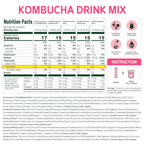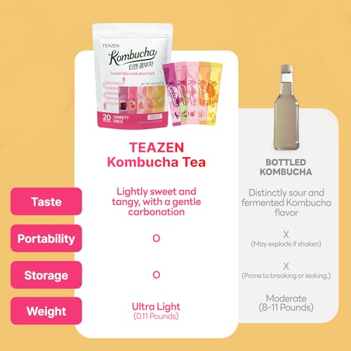 TEAZEN Kombucha Tea Sunset Bliss Hydration Variety Pack - 20 Sticks, 5 Flavors (Peach, Mango-Guava, Strawberry-Kiwi, Citron, Mulled Wine)