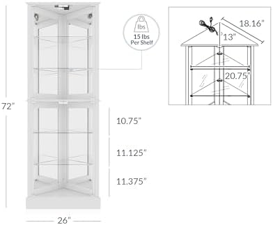 BELLEZE Lighted Accent Corner Display Curio Cabinet with Tempered Glass Doors and Shelves, Classic Wood Cabinet w\/Bulb, Corner Curio Storage Rack for Living Room, Bed-Room and Kitchen (White)