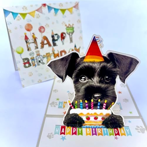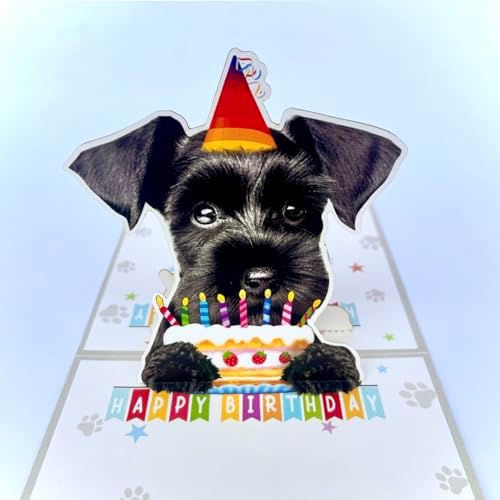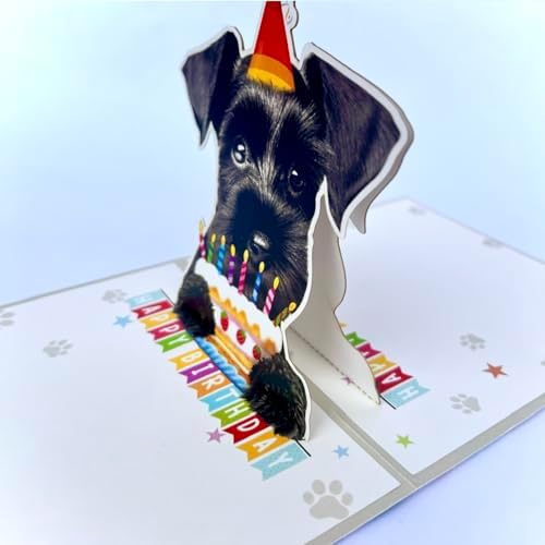 Momapopup 3D Pop-Up Black Schnauzer Dog Birthday Card - Dog with Cake Celebration, Whimsical Happy Birthday Greeting for Dog Lovers - Black Schnauzer Dog 3D Birthday Pop Up Card
