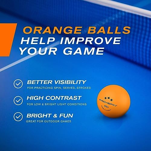SUPERIOR QUALITY PING PONG BALLS - Elevate your game with our premium ping pong balls, meticulously designed for both intense competitions and delightful family fun. Crafted to endure the fiercest serves and smashes, these table tennis balls boast exceptional durability and resilience, ensuring our table tennis equipment won't let you down during crucial moments. UNMATCHED DURABILITY - Say goodbye to inferior balls that disrupt your flow. Our 3-star ping pong balls that are available in both orange and white are engineered to withstand rigorous games on any ping pong table. Focus on perfecting table tennis shots and strategies without replacements. CONSISTENT BOUNCE AND CONTROL - Gain a competitive edge with our ping pong balls. These high-quality balls deliver a reliable and consistent bounce, empowering you to execute precision shots and strategies with ease. Feel the surge of confidence as you outplay your opponents and dominate the ping pong table. PERFECT FOR ALL TABLES - No matter the type of ping pong table you play on, our ping pong balls come in bulk and provide exceptional performance. Carefully calibrated for size and weight, meeting professional standards, our 3-star ping pong balls seamlessly integrate into your game, offering a perfect fit for your playing style. PRO-SPIN 100% HAPPINESS GUARANTEE: Our local customer service team is committed to providing the best support experience. If your ping pong balls don't arrive in perfect condition, let us know, and we’ll replace it! Buy your new ping pong balls risk-free, knowing we’ll do everything possible to ensure you’re 100% happy with your order.
