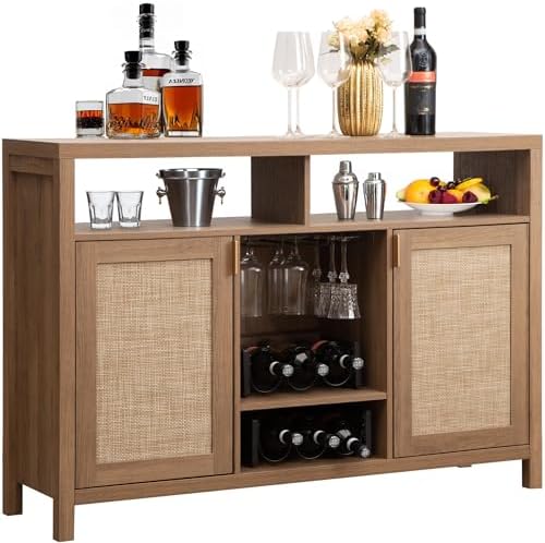 SICOTAS Coffee Bar Cabinet, 51" Rattan Sideboard Buffet Cabinet with Storage, Boho Farmhouse Liquor Cabinet with Wine Racks Credenza Console Table for Home Living Dining Room Entryway, Natural