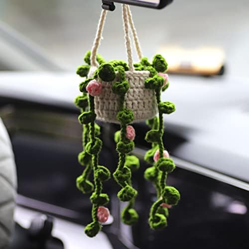 Cute Car Mirror Hanging Ornament - Decorative Rearview Mirror Accessories for Women and Girls - Handmade Knitted Crochet Plant Flower Car Accessories