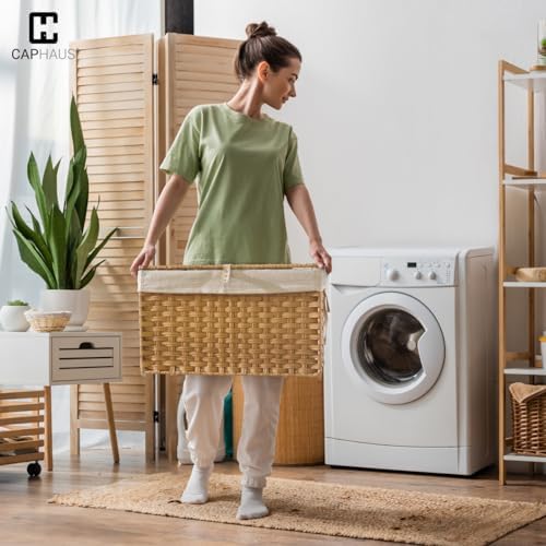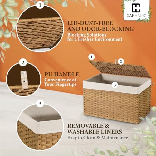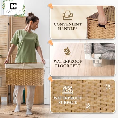 CAPHAUS Laundry Basket w\/Lid, Synthetic Rattan Laundry Hamper w\/Lid and Handles, 2 Removable Liner Bags, Foldable Clothes Hamper for Laundry, Large Storage Basket w\/Lid, 105L, Natural
