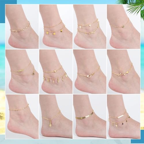 Hicarer 16 Pieces Ankle Bracelets 14K for Women Anklets Set Boho Beach Anklets Foot Chains Adjustable Foot Hand Jewelry Romantic Gift