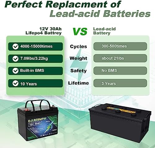 DJLBERMPW 12V 30Ah Lithium Battery 12V LiFePO4 Batteries 384W Load Power 4000+ Deep Cycle Lithium Iron Phosphate Battery Built-in 30A BMS Power Wheels Batteries for RV,Fish Finder,Emergency Light