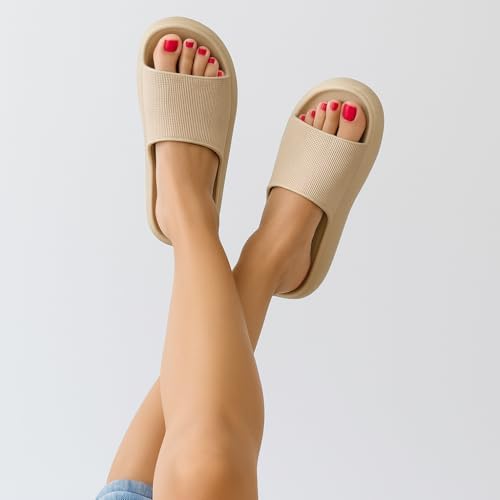 CUSHIONAIRE Feather EVA Slides for Women \u2013 Comfortable Slip On Womens Slippers, Indoor Outdoor Shower Shoes, Beach Essential Cloud Slides