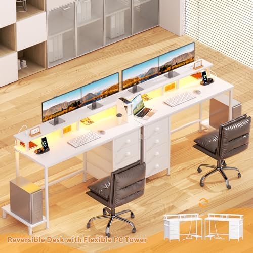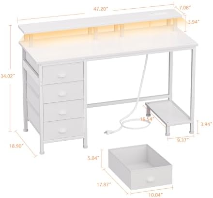 Furologee 47" White Computer Desk with 4 Fabric Drawers & Monitor Stand, Gaming Desk with Power Outlets - LED Lights, Home Office Space-Saving Study Table for Bedroom Small Spaces
