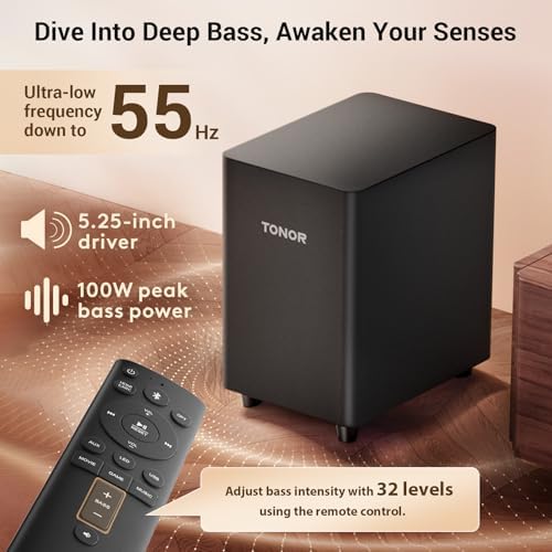 TONOR Sound Bar for Smart TV with Dolby Atmos, 2.1 Deep Bass Soundbar for TV Speaker\/PC\/Phonew, 5.3 Bluetooth, DSP Technology, 3 Modes, Home Theater Audio Sound System Work with HDMI eARC\/Opt\/AUX\