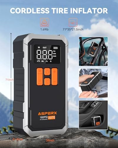 AsperX 160PSI Cordless Tire Inflator Air Compressor \u2013 Portable Rechargeable Air Pump with LCD Display, Auto Shut Off, LED Light & Carrying Case Fast Inflation for Car Tires, Bike, Motorcycle