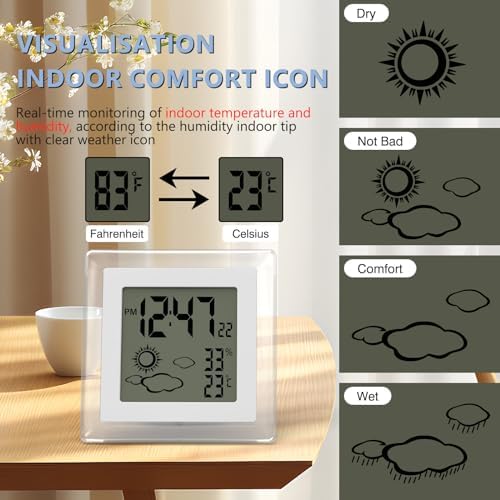 VOILEIPAGI Small Clock Digital Battery Operated Alarm Clock with Auto Backlight, Indoor Temperature Humidity, 12\/24H, Date, Travel Alarm Clock Desk Clock Small Clock for Shelf (Battery Included)