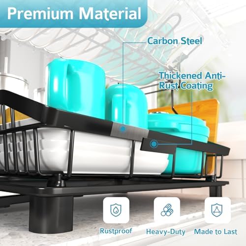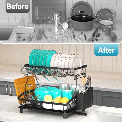Ricobes Dish Drying Rack - 2 Tier Large Capacity Dish Rack- Dish Racks for Kitchen Counter with Drainboard, Rustproof Dish Drainer with Removable Utensil Holder,Cutting Board Holder,Cup Holder, Black