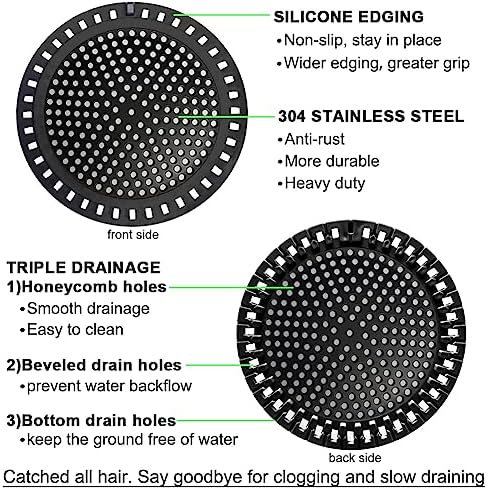[HAIR DRAIN CATCHER]4.75 x 4.75inch, 0.08 inch drain pore, with large wide rim for collected hair and debris. Fit for most US shower stall drain, bathtub drain, bathroom floor drain, bathroom sink drain and laundry tub drain. [PREMIUM MATETIAL] These bahtub drain hair catchers are made of 304 stainless steel and overall with soft silicone. Rust-free and not deformed. The soft silicone around the edge makes the drain shield strong suction. [EASY TO CLEAN] Hair will be caught on the shower drain hair catcher and can be easily cleaned with just a tissue. [SMOOTH DRAINAGE] Full bore honeycomb designed with 0.08 inch diameter poles. Seatery shower drain cover strainer can effectively grab the hair and debris and keeps the drainage flowing smoothly. [SAVE MONEY and ENVIRONMENT] A single plumber visit can cost hundreds. Drain snakes and liquid drain cleaners are a hassle to use and aren't always effective—not to mention the toll they take on the environment and on your pipes.