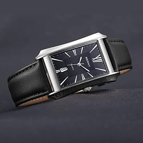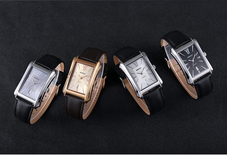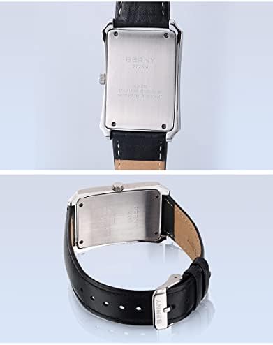 BERNY Mens Business Casual Quartz Watches Stainless Steel Case with Leather Strap Rectangular Watches for Men (Black, White, Grey, Rose Gold)