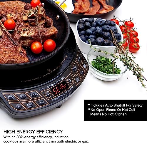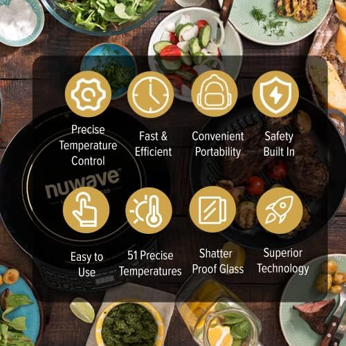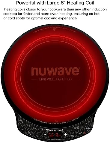 Nuwave Precision Induction Cooktop Gold, 12\u201D Shatter-Proof Ceramic Glass Surface, Large 8\u201D Heating Coil, Portable, 51Temp Settings 100°F to 575°F, 3 Wattage Settings 600, 900, and 1500 Watts