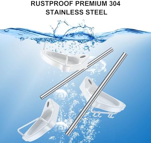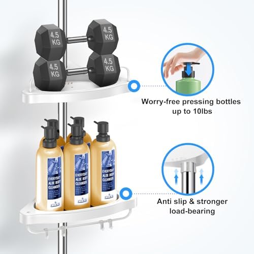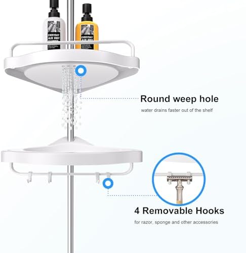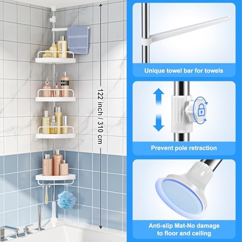 Corner shower rack, stainless steel shower rack tension rod, suitable for bathrooms, rust proof shower rack rod, with anti slip silicone pad, 4-layer adjustable rack and 8 hooks, height adjustable fro