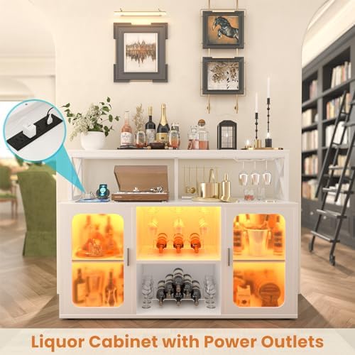 Aheaplus Bar Cabinet with Power Outlet, Liquor Cabinet with Led Lights and Glass Holders, Storage Buffet Cabinet Coffee Bar Cabinet for Liquor, Wine Cabinet with Racks for Home, Kitchen,-G2, White
