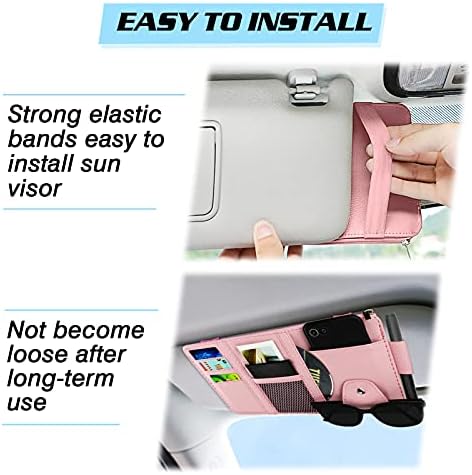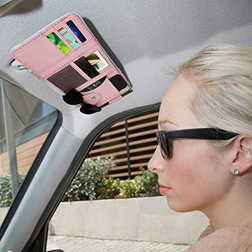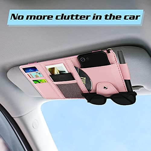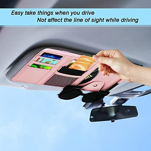 Car Sun Visor Organizer, Leather Pocket Organizer Sunglass Holder for Car Interior Accessories with Multi-Pocket Net Zipper (Pink)