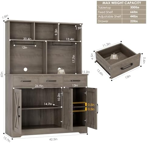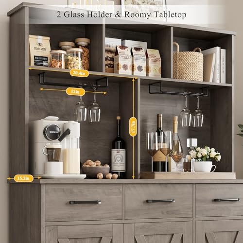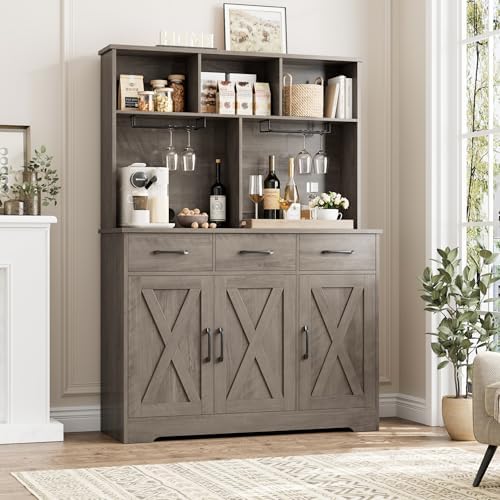 HOSTACK Buffet Cabinet with Hutch, Modern Farmhouse Kitchen Buffet Sideboard Storage with 3 Drawers, Barn Door Coffee Bar Station, Liquor Cabinet for Dining Room, Living Room, Ash Grey
