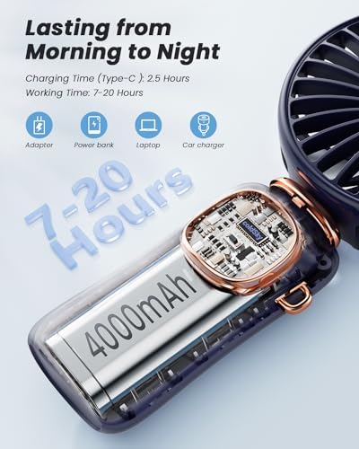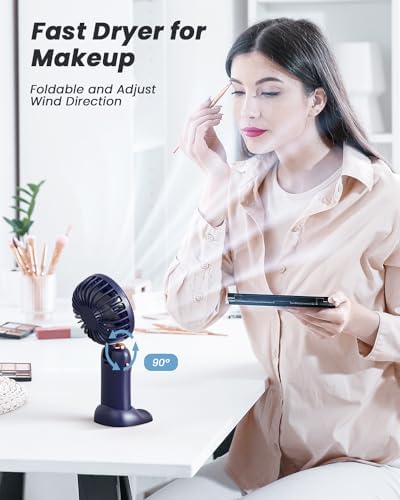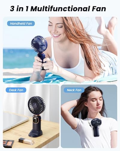 coldSky Portable Handheld Fan, 4000mAh Battery Operated Fan with LED Display, Handheld\/Neck\/Desk 3 in 1 Personal Small Fans, 90° Foldable Desk Fan with Base, 5 Speed Makeup Lash Fan for Women Blue