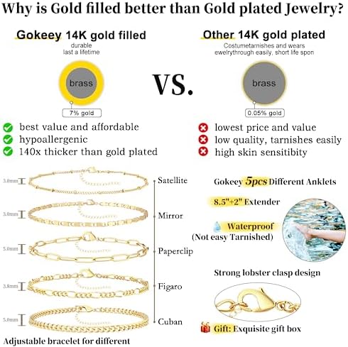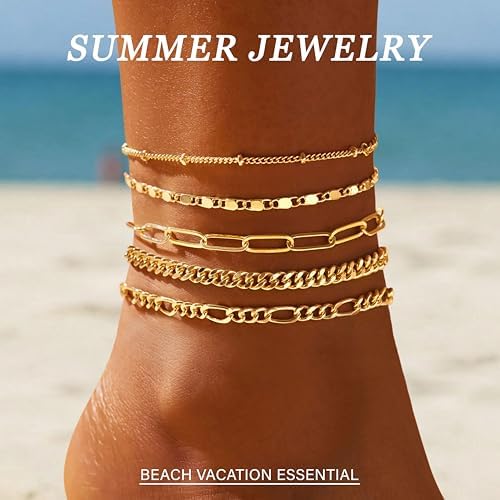 Gokeey Ankle Bracelets for Women, 14k Gold Jewelry Set Waterproof Layered Cuban Figaro Link Chain Anklets Set Gold Anklets Summer Boho Beach Jewelry Gift Adjustable Size