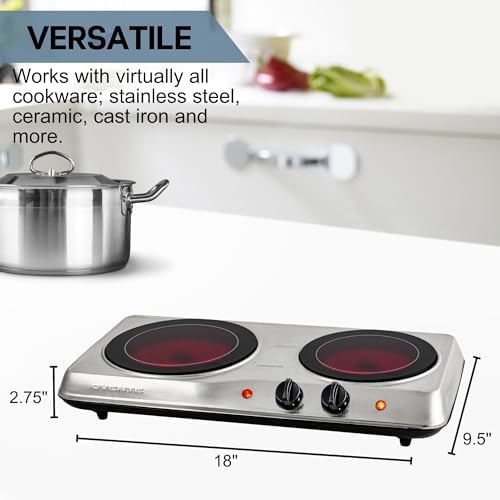 OVENTE Countertop Infrared Double Burner, 1700W Electric Hot Plate and Portable Stove with 7.75" and 6.75" Ceramic Glass Cooktop, 5 Level Temperature Setting and Easy to Clean Base, Silver BGI