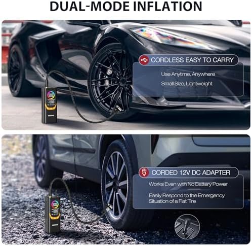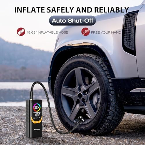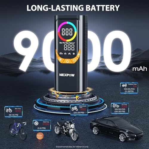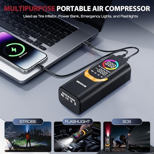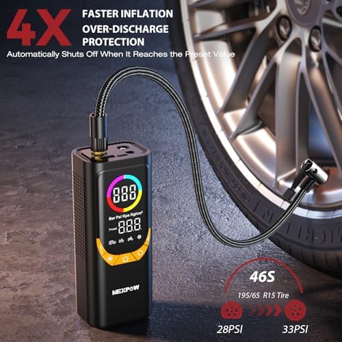 NEXPOW NP17 Portable Air Compressor, 150 PSI Digital Tire Inflator, Fast Inflation with Auto Shut-Off, LED Light, Multiple Nozzles for Car, Bike, and Ball, Compact Design, Yellow
