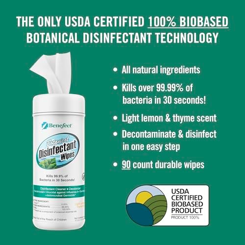 Benefect Botanical Disinfecting Wipes - (90 Wipe Count) Natural, No Residue - Antibacterial Disinfectant, Multi-Surface Cleaning and Sanitizing Wipes