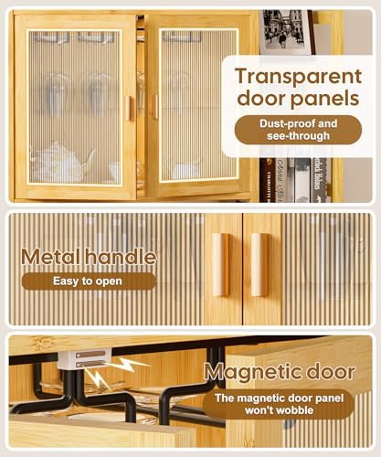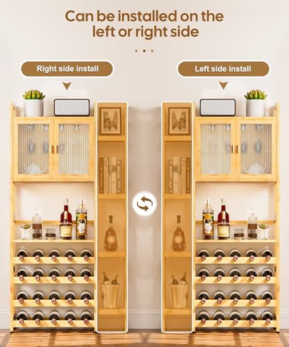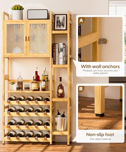 Cozivolife Wine Bar Cabinet,Wine Rack Floor Free with Doors Glass Holder,4 Tiers Wine Bottle Storage and Side 4-Layer Shelves for Living Room, Dining Room, Kitchen(Bamboo)