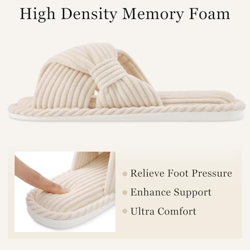 Evshine Summer House Slippers for Women Corduroy Cross Bow Indoor Slippers Open Toe Slip On Bedroom Shoes with Memory Foam